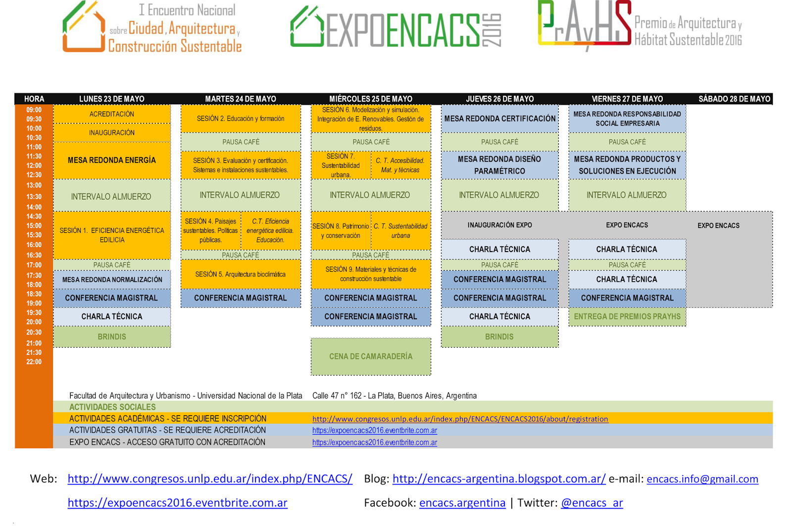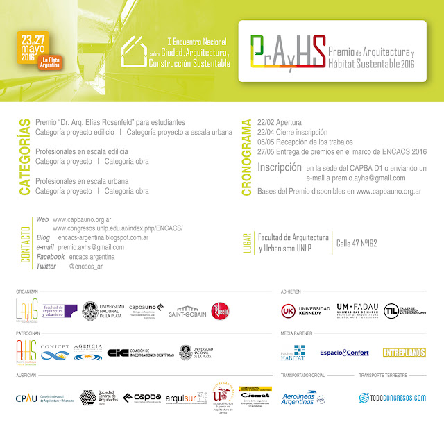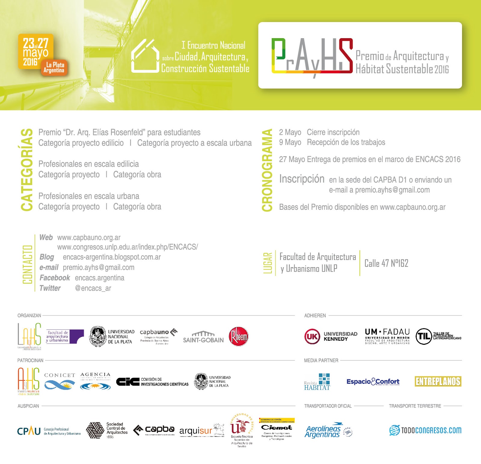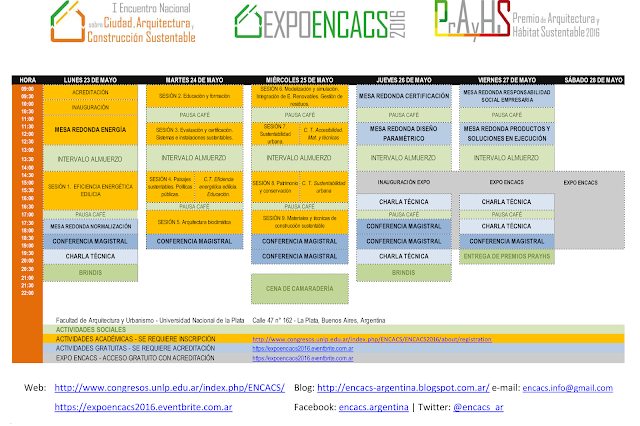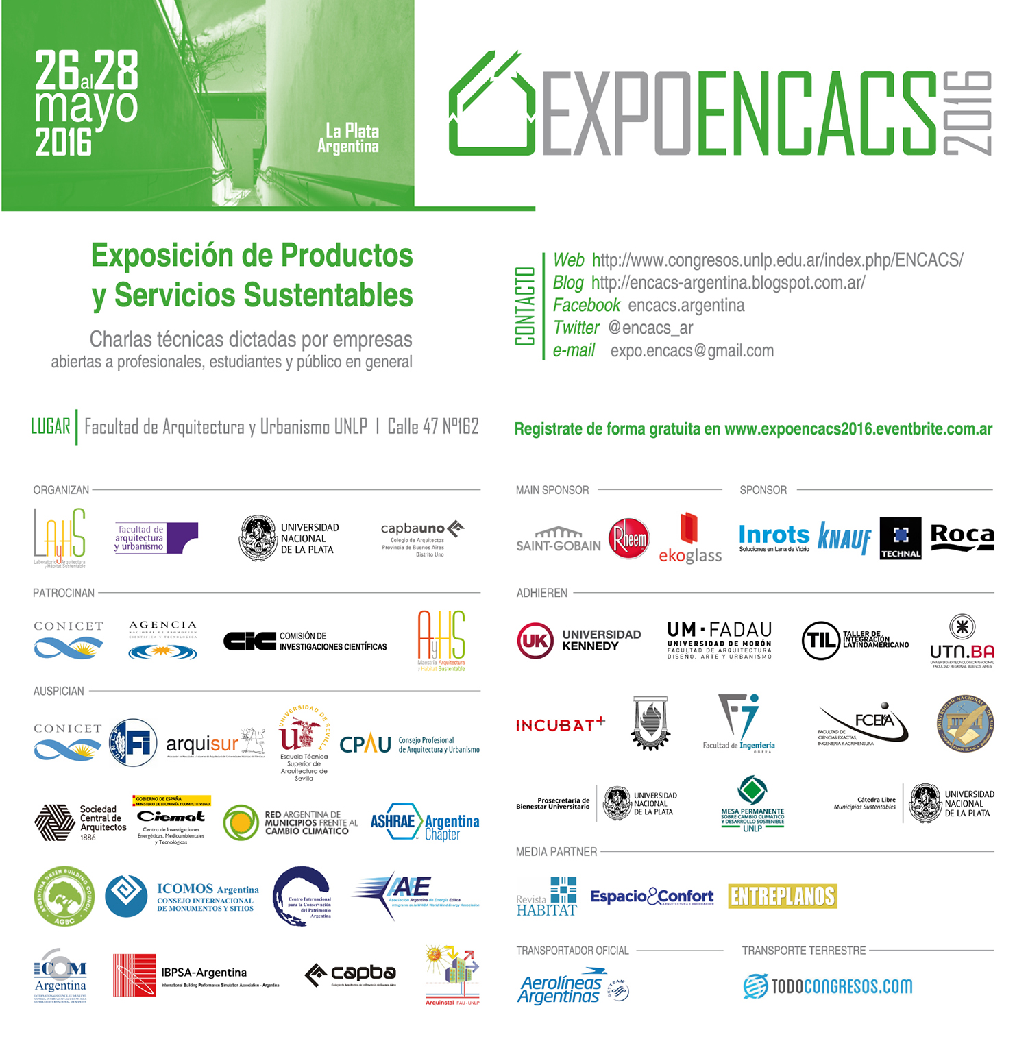 En el marco del I Encuentro Nacional sobre Ciudad, Arquitectura y Construcción Sustentable, el Laboratorio de Arquitectura y Hábitat Sustentable (LAyHS), la Facultad de Arquitectura y Urbanismo (FAU), la Universidad Nacional de La Plata (UNLP) y el Colegio de Arquitectos de la Provincia de Buenos Aires Distrito 1 (CAPBA D1) organizan ExpoENCACS2016, exposición de Productos y Servicios Sustentables, que contará además con Charlas Técnicas dictadas por empresas.