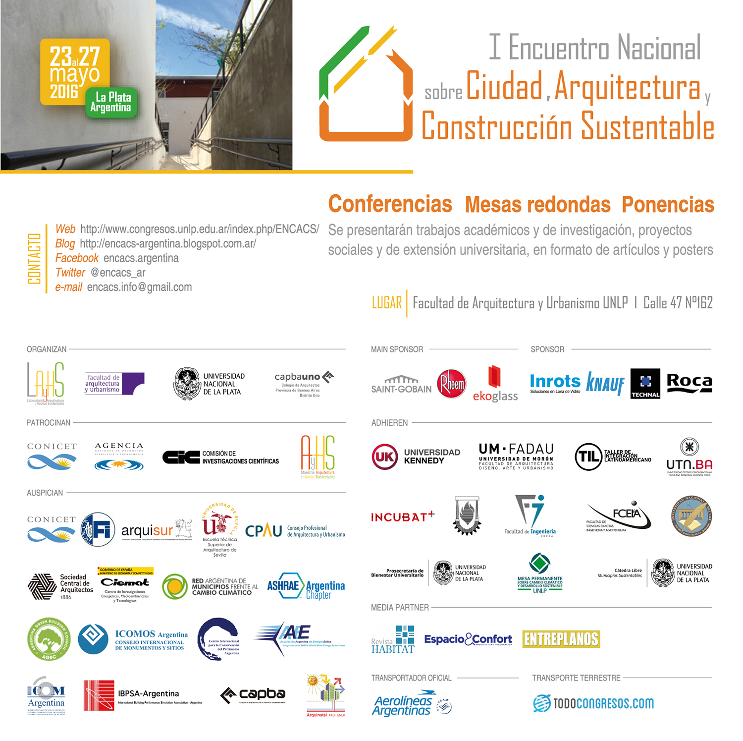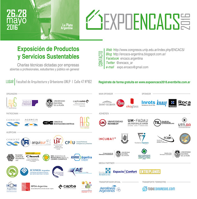 El evento tiene como Main Sponsors a SAINT-GOBAIN Argentina, RHEEM y Ekoglass, además cuenta con INROTS Sudamericana, Knauf, Technal y Roca como Sponsors e Ideal, Enersol, Gensolar, Kusco, GinoCorrugatti y Tu Punto como expositores. Estará abierta a profesionales, estudiantes y público en general, se realizará del 26 al 28 de Mayo de 2016 en la Facultad de Arquitectura y Urbanismo, Universidad Nacional de La Plata.